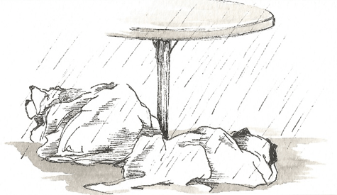 It don’t take long for Donuts to find some well hard streetlegs for his forward pack – Drizzle and Tuffy, anyways. Both are lying under Costa Coffee tables, sheltering from the rainlick.