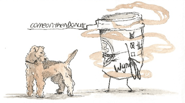 “stayhereDonuts,needmylowfatlatte” Wynn ties up the Welsh Terrier to a table leg and wobbles inside.