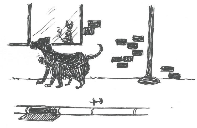 Vexed, I’m very vexed ThreeLegs considers his state of mind, that place where all thoughts of noshing, eightleggers and sniffing live in a perpetual mush between the earflaps. And thinking about noshing, Threelegs’ belly reminds him he’s missing out on his brekkers at Freddy’s Farm. Bacon, well done scraps of bacon, anyways. Toast, the crusts. Sausage – burnt to perfection – and a touch of healthy kicking or a sudden wack out of nowhere from Freddy with his big stick. He is panting fast, tongue lolling. Thinking of home, starting to miss it all.