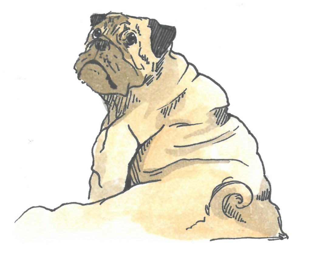And, there’s packdad wot lyks all sorts of nosh but don’t lyk sticking it anywhere, ‘cept down his own little nosh hole.  This unnatural behaviour is a work in progress for Bananas.  Finally there’s packmommy who don’t lyk much of anything and who certainly don’t lyk sticking nosh down Bananas’ anytime. That’s also a WIP.  But, at least the three pups lyk sticking nosh down Bananas nosh hole and that’s a fine start.  All in all a sort of C+ houseden according to the fawn-coloured Pug, suggesting a lot of improvement room for canine welfare.