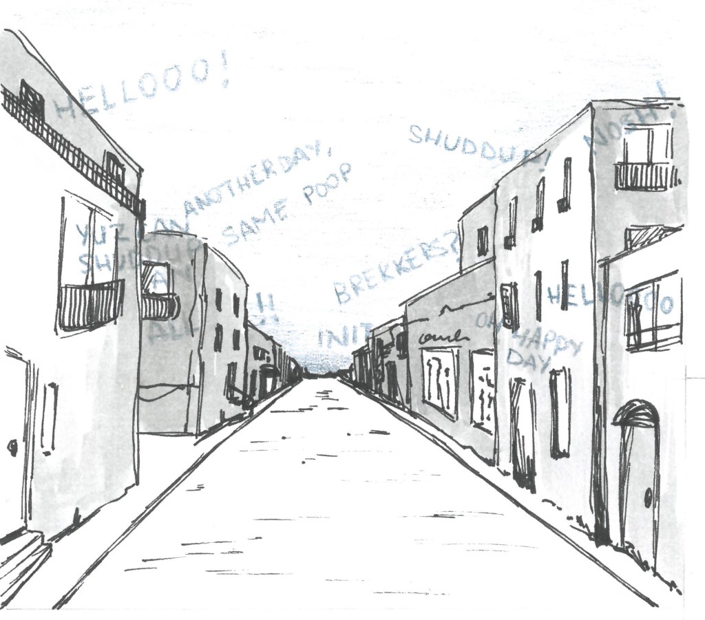 Gitorrf! don’t know any pedestrians – perhaps they are a bit lyk hindlegs or some sort of scratch who only live in Short Cut.  Wotever!  All he can snifz are hindlegs wobbling about carrying paper bags full of nosh from the coffee shops.