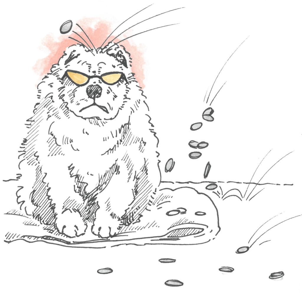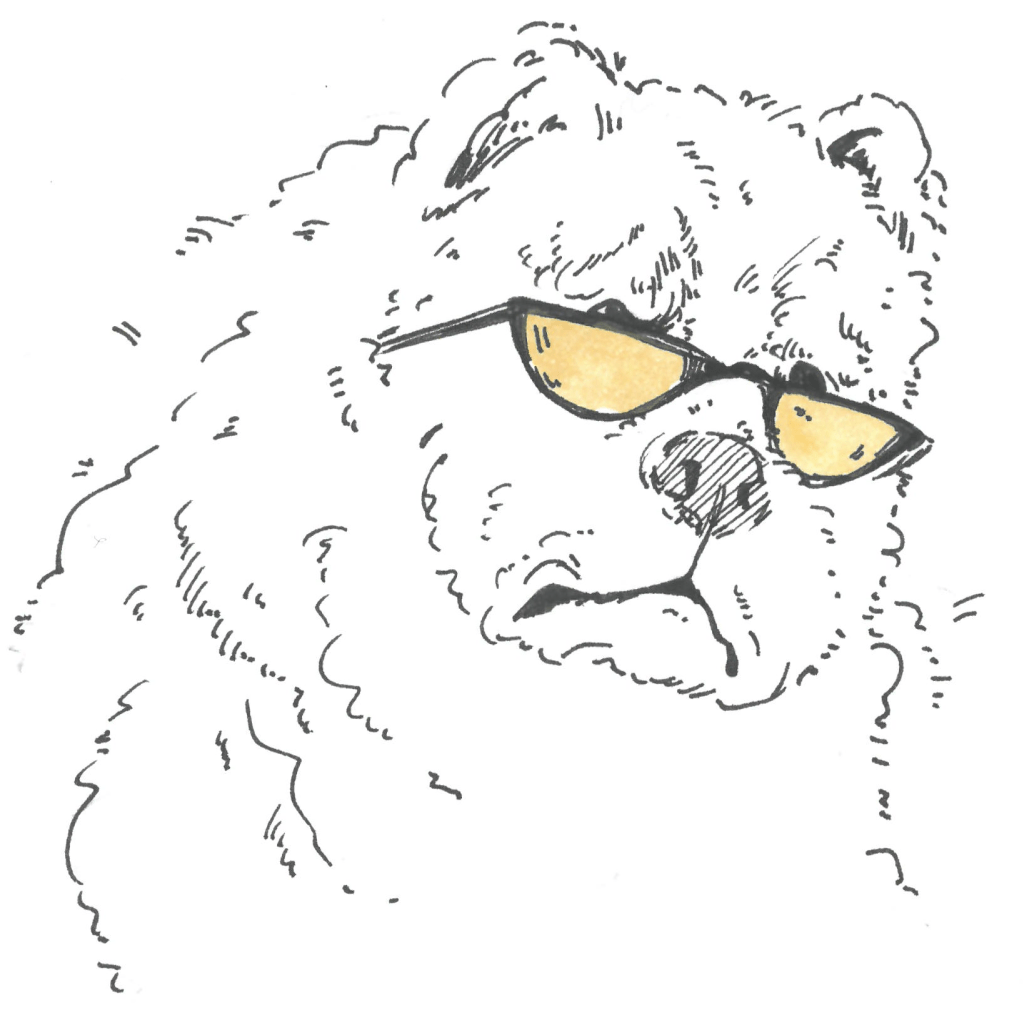 Paddles the overweight Chow Chow wears his cheerfulness beneath a neon pink-coloured fluffy hide.  Newly sprayed, his snout twitching in mild allergies, and getting last minute touches from Lavinka before his presentation to the pedestrians in the big city – West Pid. that is.  She combs his fur over and over til static makes it stand on end in a big electric pink fuzz. Lavinka then ties a Union Jack bandana ‘round his large neck, completing the look with a pair of gold-tinted aviator shades squashed over his small eyeholes. Paddles is transformed into a teddy-bear Elvis Presley, standing foursquare with black tongue clenched between teeth, quietly enduring this ritual of tender loving care.