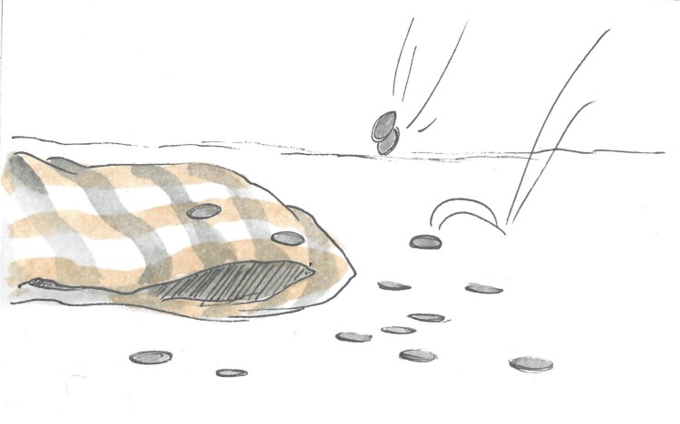 Who better than Paddles sitting upon his tartan blanket halfway along Short Cut and blazing away in a big fuzzy blob of neon pink. Funny thing is the bright hot ball in the sky now shines on Squeezy squeezing her accordion and lighting up Paddles in an eyeball-watering corona. It ain’t the pink color wot Bananas eyeballs – coz fourlegs don’t catch many colours, ‘cept blues and greys – but Paddles fuzzy shape reminds her of thems strange things Oskar lyks to stick on the end of little twigs; wot he calls pencils.