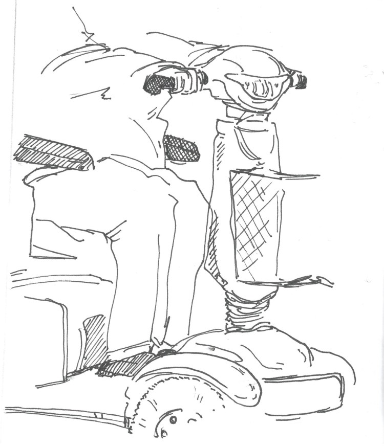 Gunther raises his snout and sniffs disdainfully at the mobility scooter.