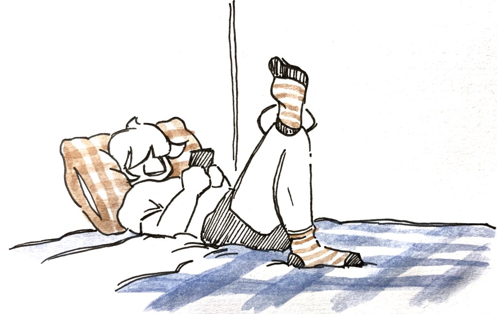 But Aaron is more interested in sitting on his bed and punching one pawfinger into his other handpaw to tell his mates all about the pup.