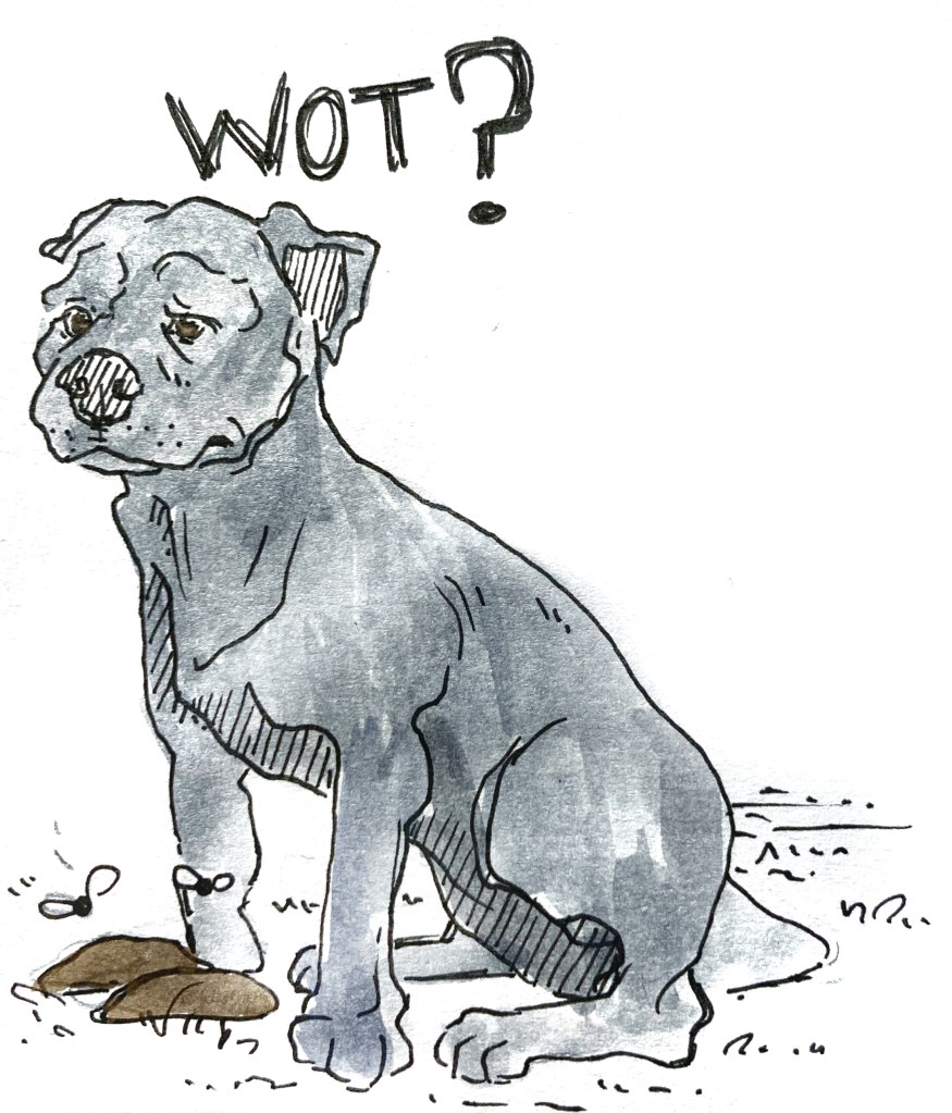 Better trot on, mate, feds’re gonna come Tuffy suggests, still sitting beside his poop and scratching his one earflap.