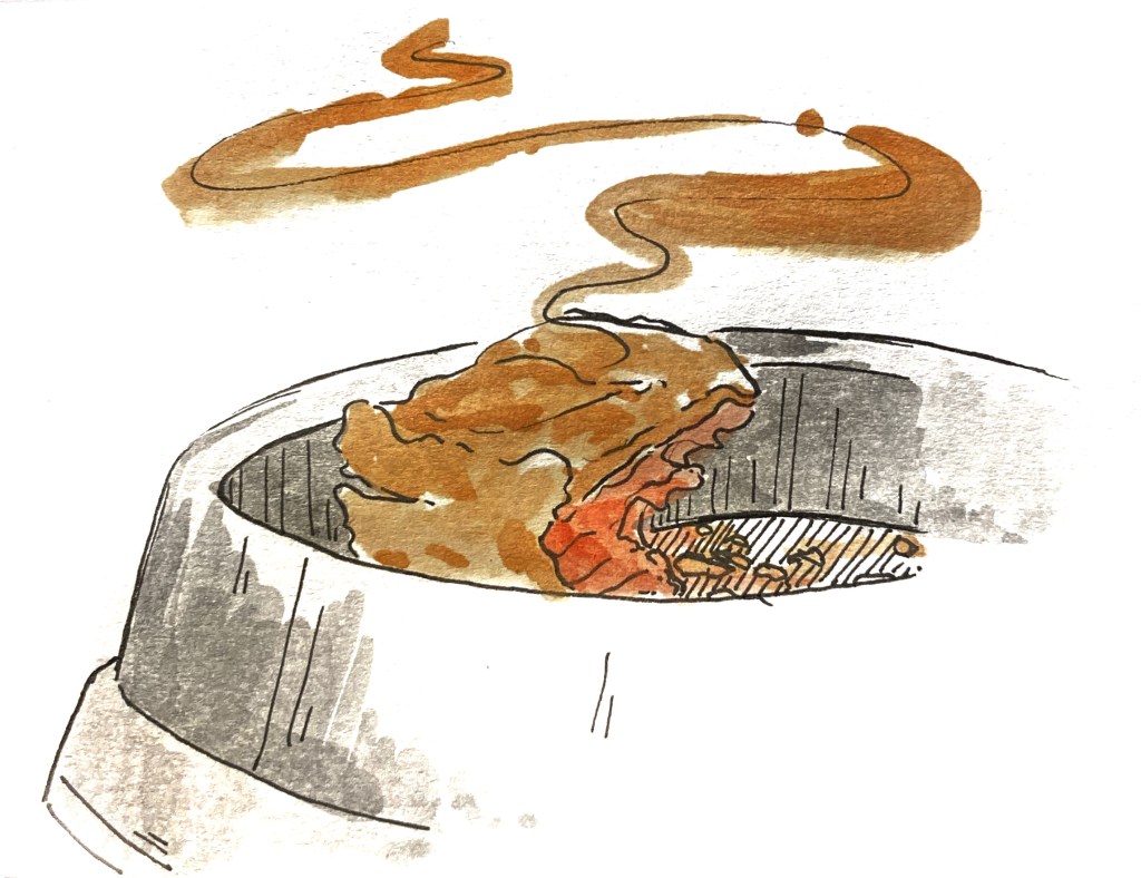 A cold pork pie is in AndyLeg’s handpaw and being carried towards the kitchen table. Trouble is, AndyLegs also lyks his nosh a bit too much for his own good. Half the pork pie is already down his own gob before it gets there. The other half, corss, goes straight down Giblet’s nosh hole.