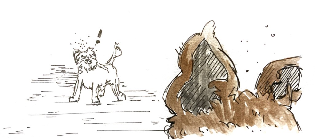 Giblets eyeballs thems til they disappear up the road and ‘round the corner, the snifz fading away shortly after. The whole time Shepherdman shaking on his little paws.