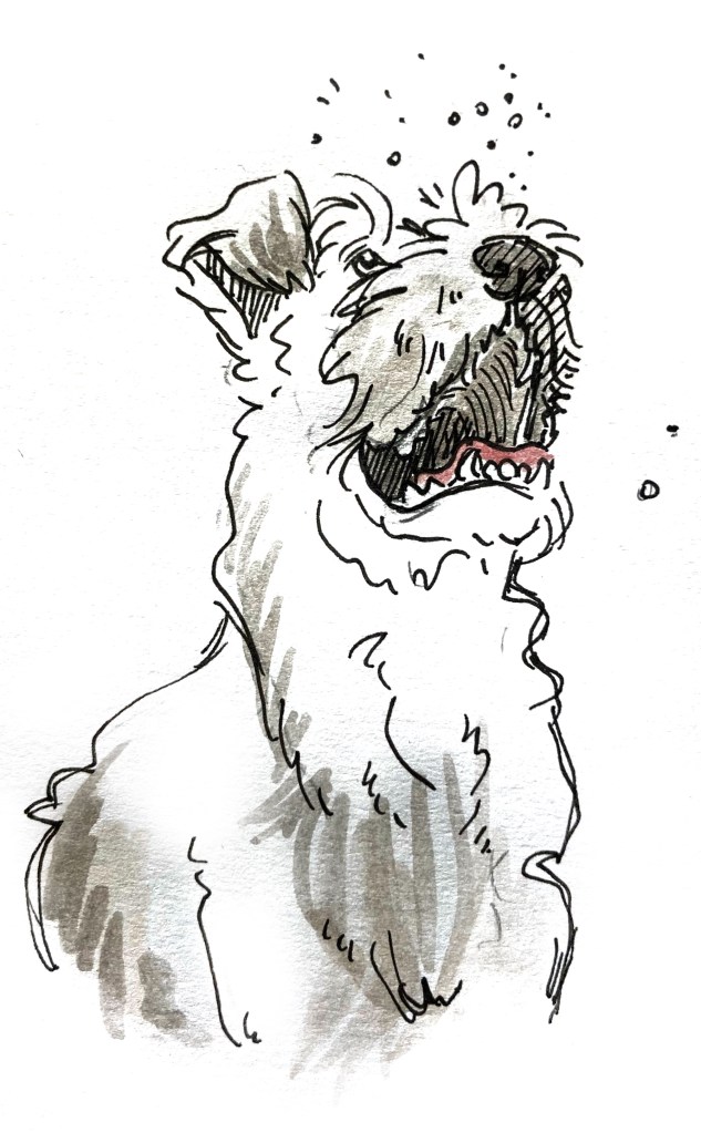 Snifz yu, me old mucker GitOrrf! barks moments later. The Border Terrier stands on the pavement eyeballing his friend wotz upstairs.